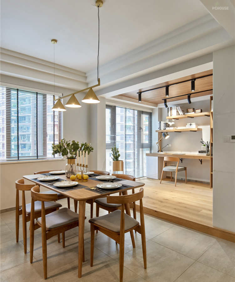 餐厅和书房的原木桌椅,仿佛有热气升腾,悄无声息沁入开阔空间,缔造出专属自己的温暖港湾。