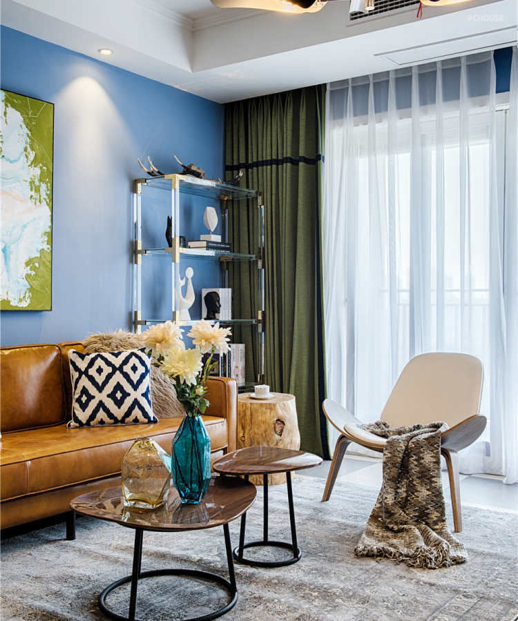 通过不断调节普鲁士蓝、青灰、绿玳瑁色饱和度,实现客厅色彩层次的丰富度。