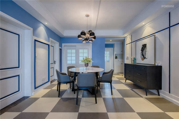餐厅的色彩和质地是整个大空间的美好衍生,普鲁士蓝大基调、不同灰度明暗的白色共同构建一个几何空间。