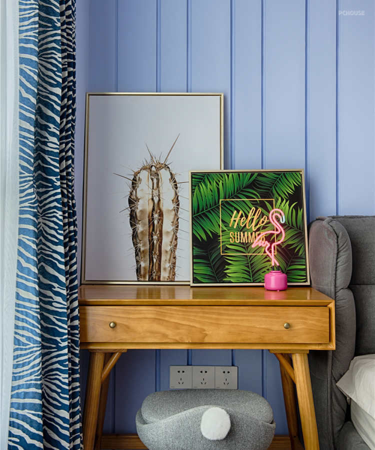 奠定主卧空间清新干净的基调,纤维植物的曲线,竖线的几何形态。