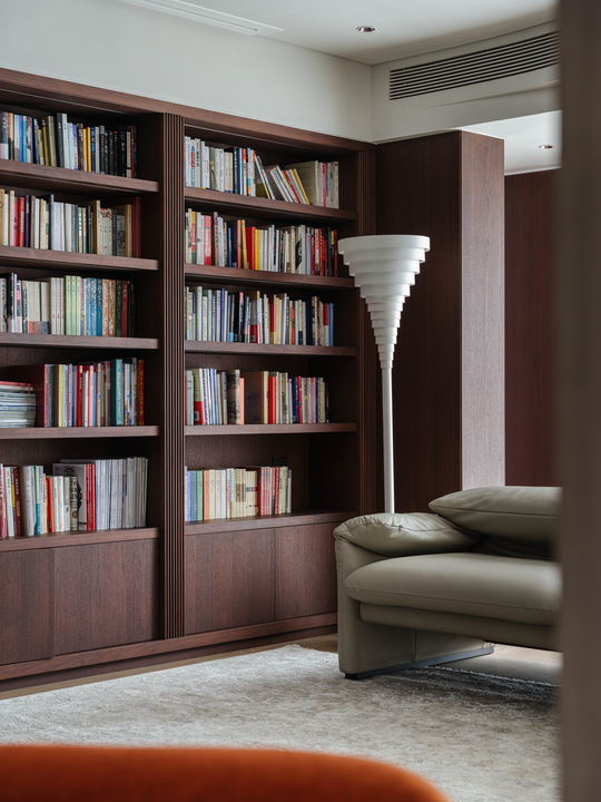 越来越多的年轻家庭有了自己独特的生活方式,我们一直提倡的,没有什么固定的模式,符合居住者生活习惯的,就是最合适的设计。电视也越来越不是客厅活动的中心,在这里,图书、乐器、钢琴成为了空间的核心用柜体补充了公共区域的收纳空间。客厅原本的区域本就足够,剩下的就只有顺理成章。