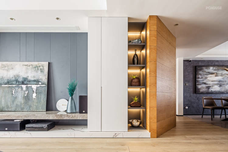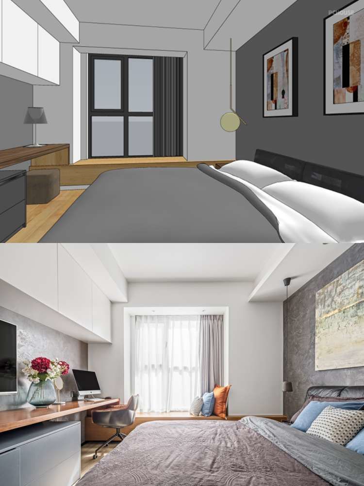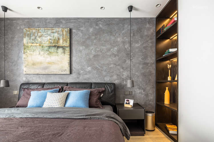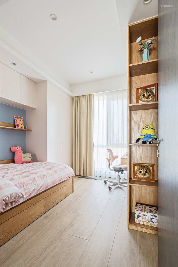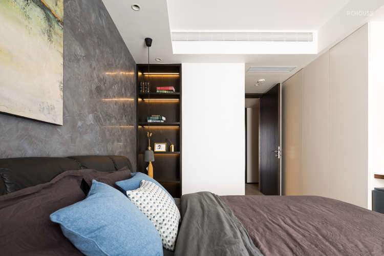 这是主卧的背景,故意改了墙体做了一段书架,丰富立面,业主可以放一些正在看的书籍在这里