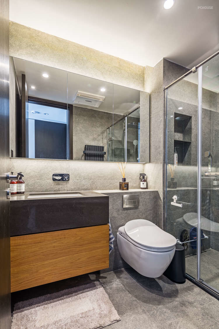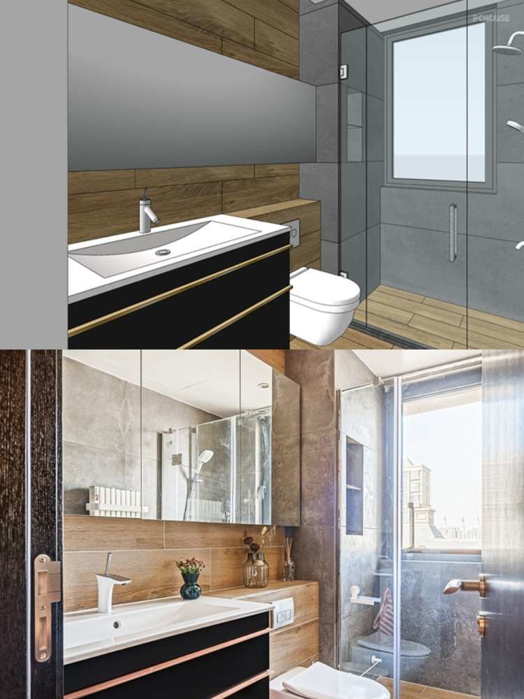 这是次卫,当时客户来找到我们的时候,她材料已经买了一半了,所以这个卫生间出现了两种花色的砖,这种做法是我不推荐的。下面一张主卫,就是我们重新配的材料设计的,小空间的卫生间,特别是现代风格最好同色