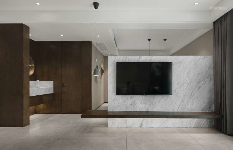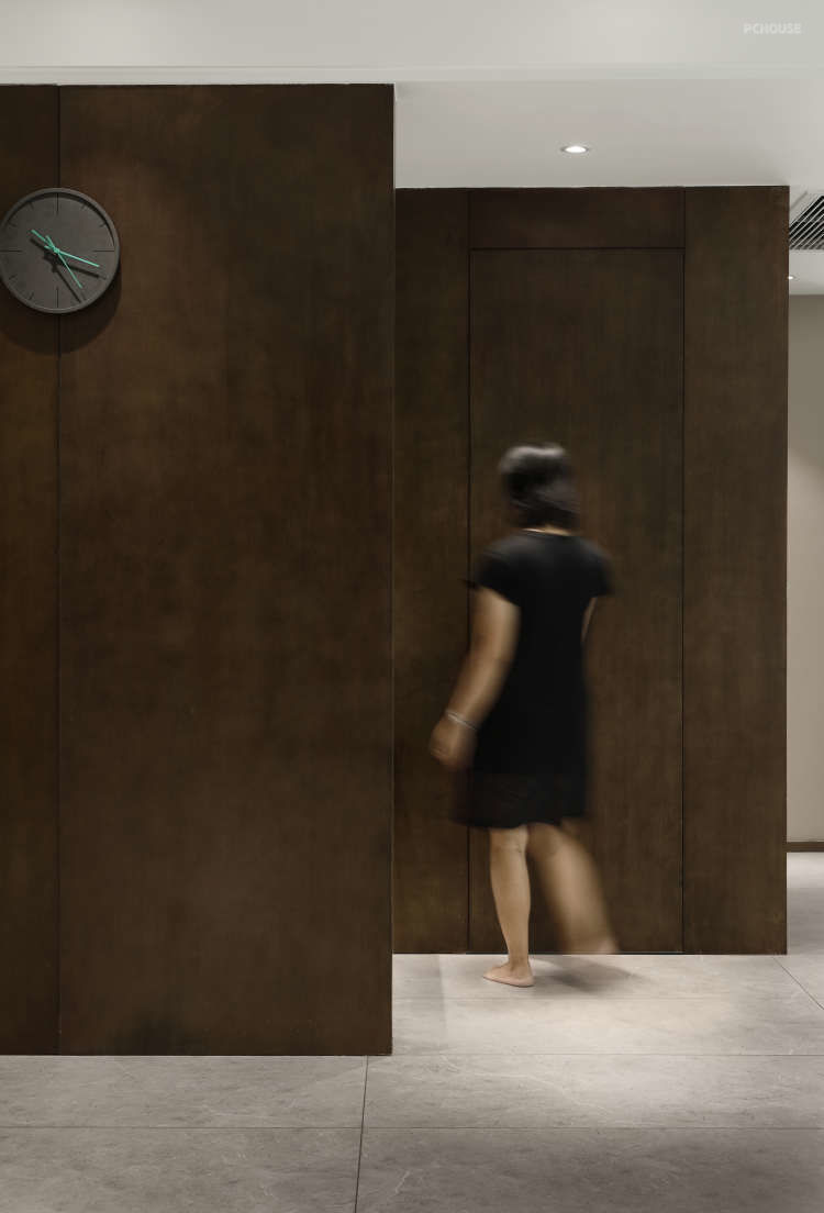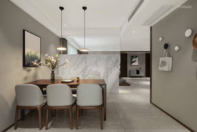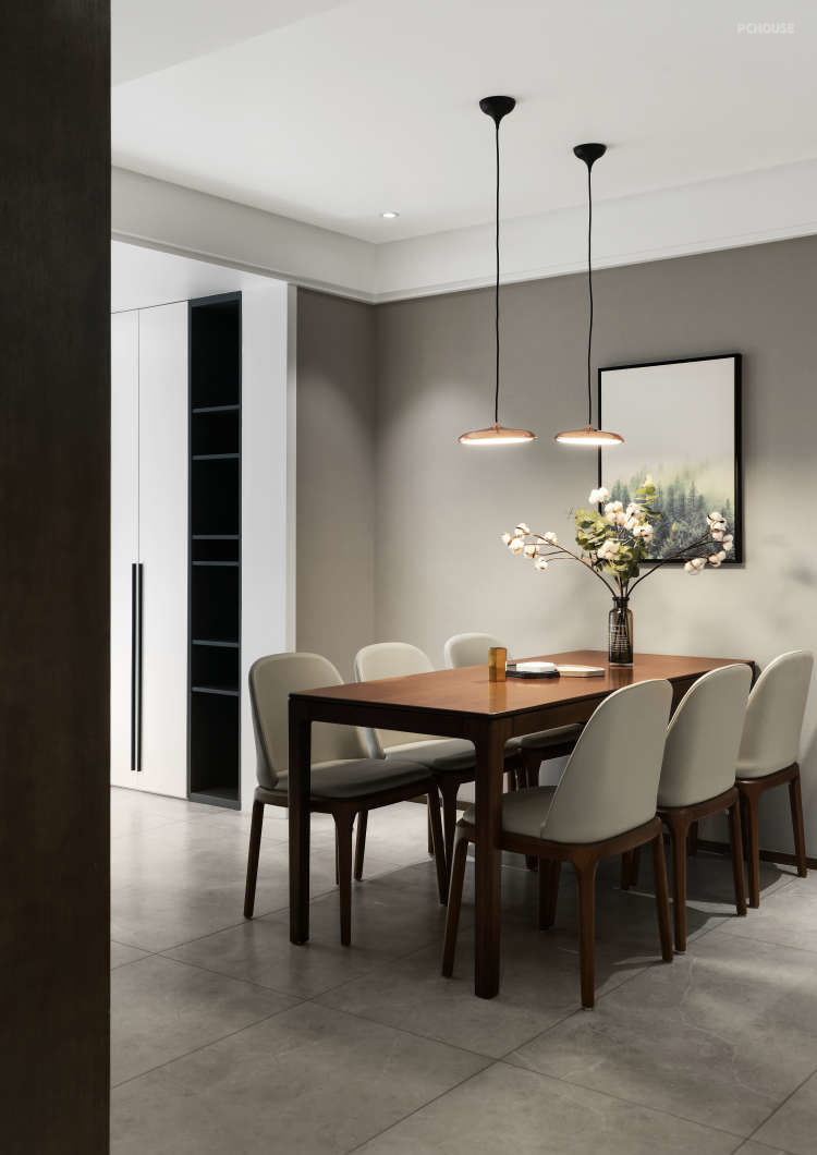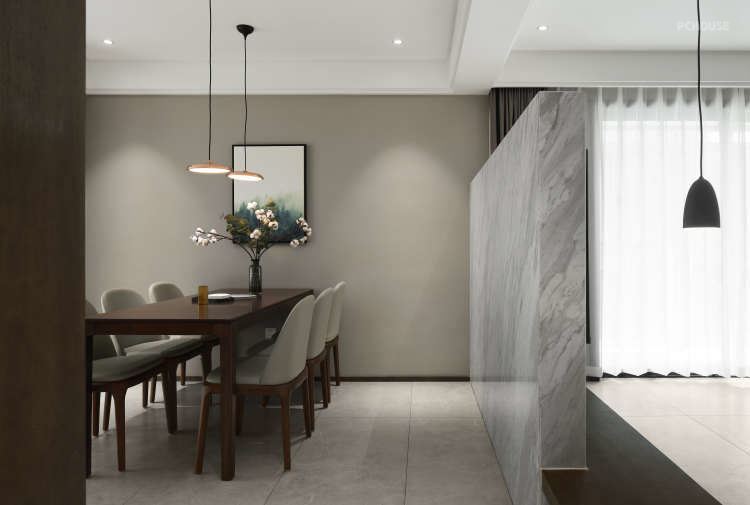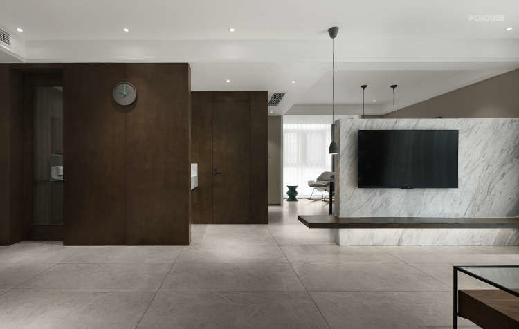 不同的材质在空间中相遇,一半冷峻,一半温柔。纵横的线条交错出意味深长的丰富多变。家人、朋友在这谈笑风生,感受家带来的闲适、轻松的生活氛围。