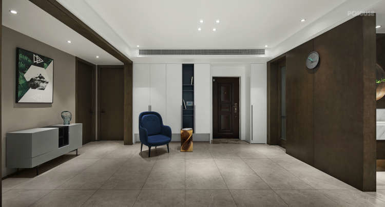 化繁为简,是对平淡生活的一种表达。黑白的视觉效果为空间带来更深邃的延伸感,深蓝色的沙发与质朴的木几柔化了空间的线条,也为生活增添了些许情趣。关上门,深陷其中,感受家的舒适、祥和。