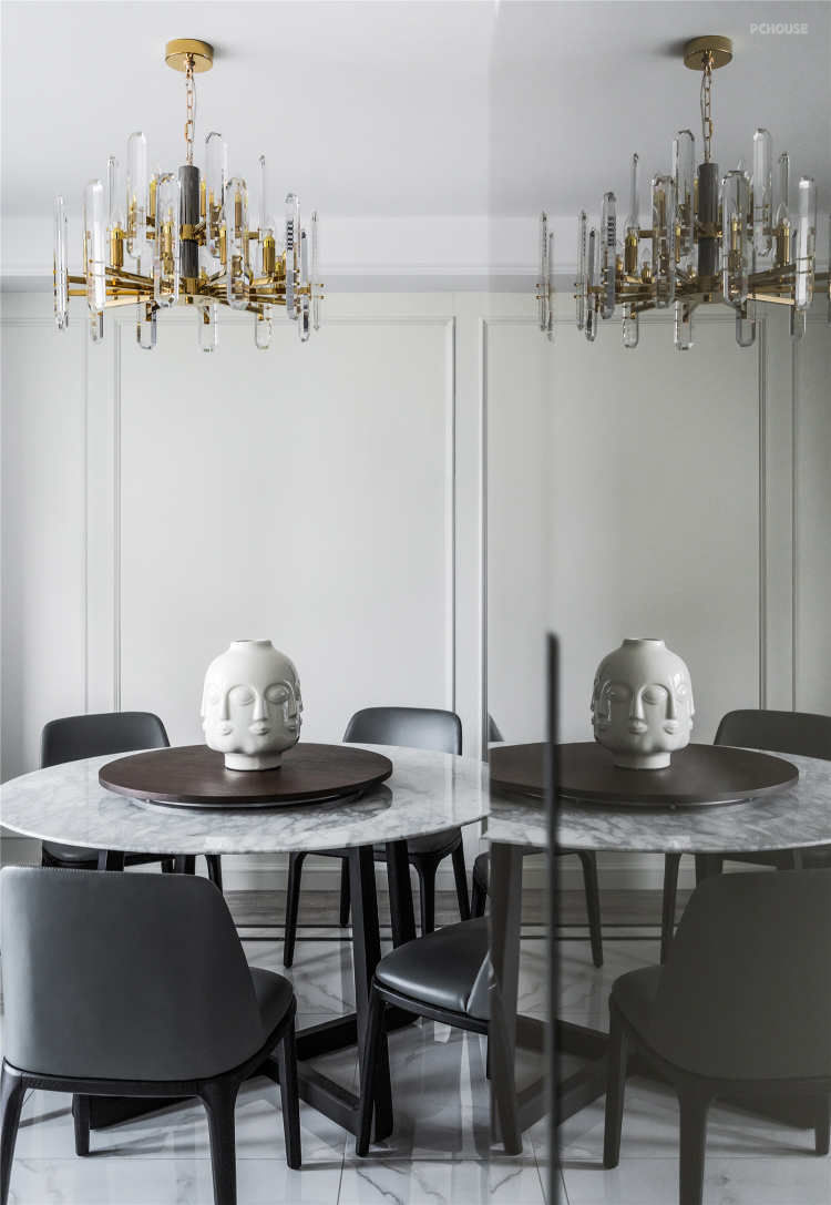 不管是客厅还是餐厅,设计师都选择了时尚优雅的鸽子灰作为空间主色调,与金属点缀相呼应,自然凸显空间主人的高雅品味。