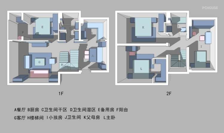 1、1F蓝色区为原餐厅,缺点入户正对餐桌位置,鞋柜也没有合适位置摆放。2、1F黄色区卫生间太小,无法满足P姐对干湿分离的诉求。3、1F粉色楼梯区,采光弱、与客厅互动性差,对流也受到很大影响。