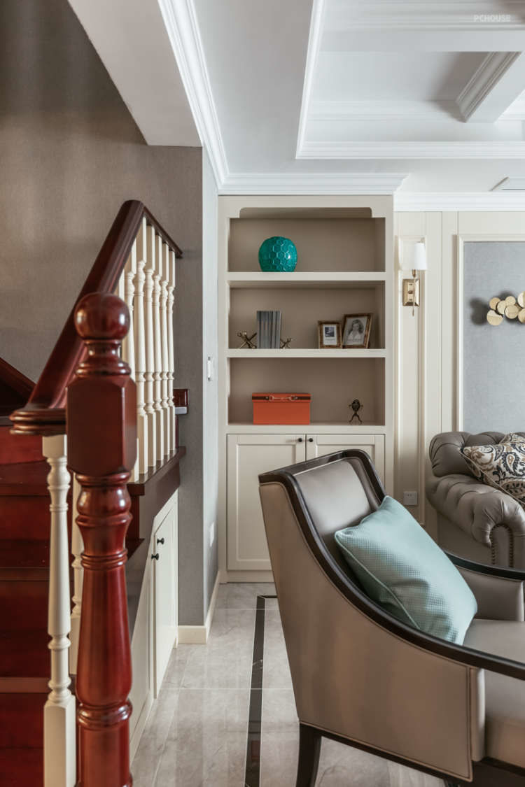 楼梯一侧拆除了原来的墙体,把楼梯敞开来,与客厅有更好的互动关系,也满足了楼梯间的采光和通风需求,沙发两侧装饰柜,实用又美观。