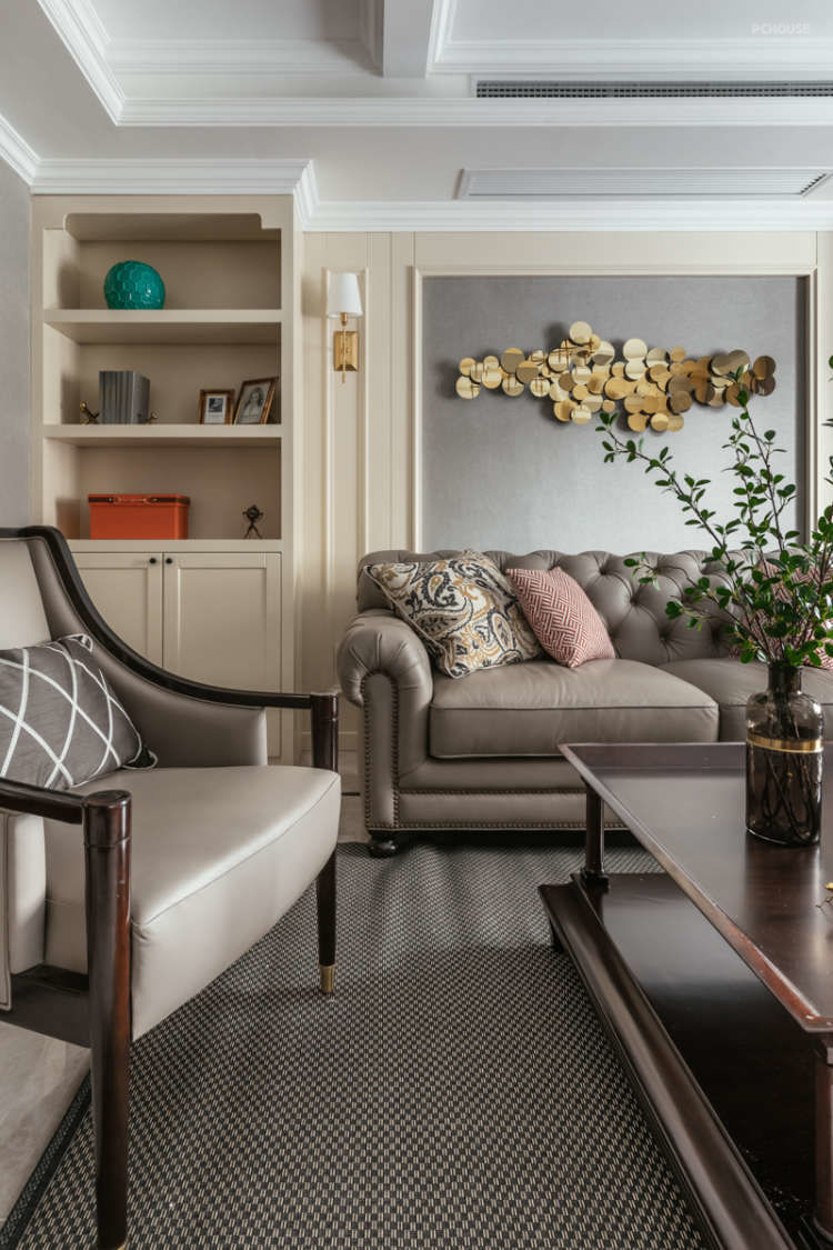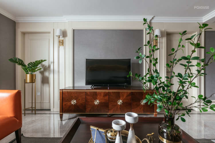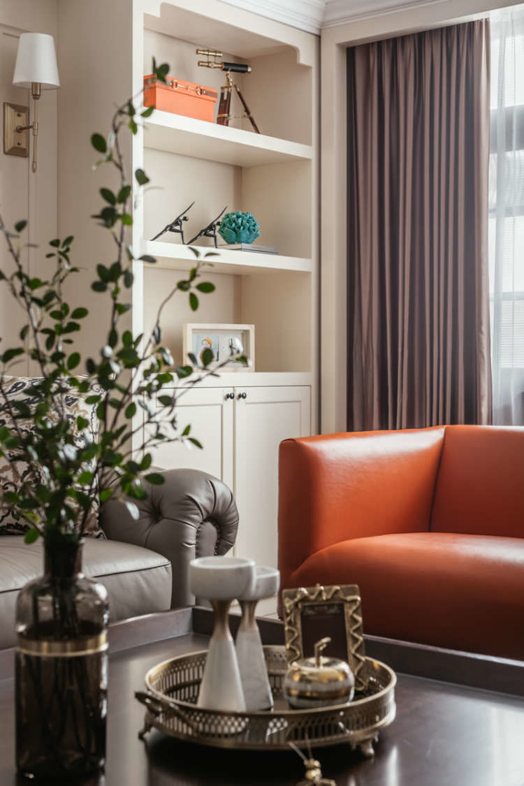 装饰柜选择了同样爱马仕橙色的收纳盒和爱马仕沙发遥相呼应。客厅在色彩上围绕着灰咖色调,融入金色、活力橙等点缀色。灰咖墙纸点缀金色亮片壁挂,摩登与精致并存。金属饰品、美式吊灯、皮质沙发、木质家具让整个客厅时尚又沉稳。