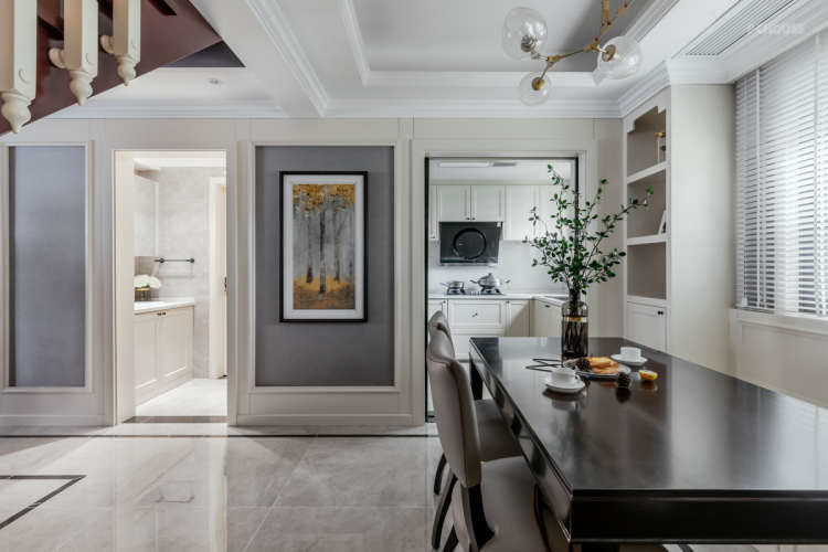 绿色米仔兰、餐厅气泡吊灯,让通透清雅色调的餐厅瞬间变得活跃起来,仿佛到了春天。眼前满是果树馨香与绿荫。