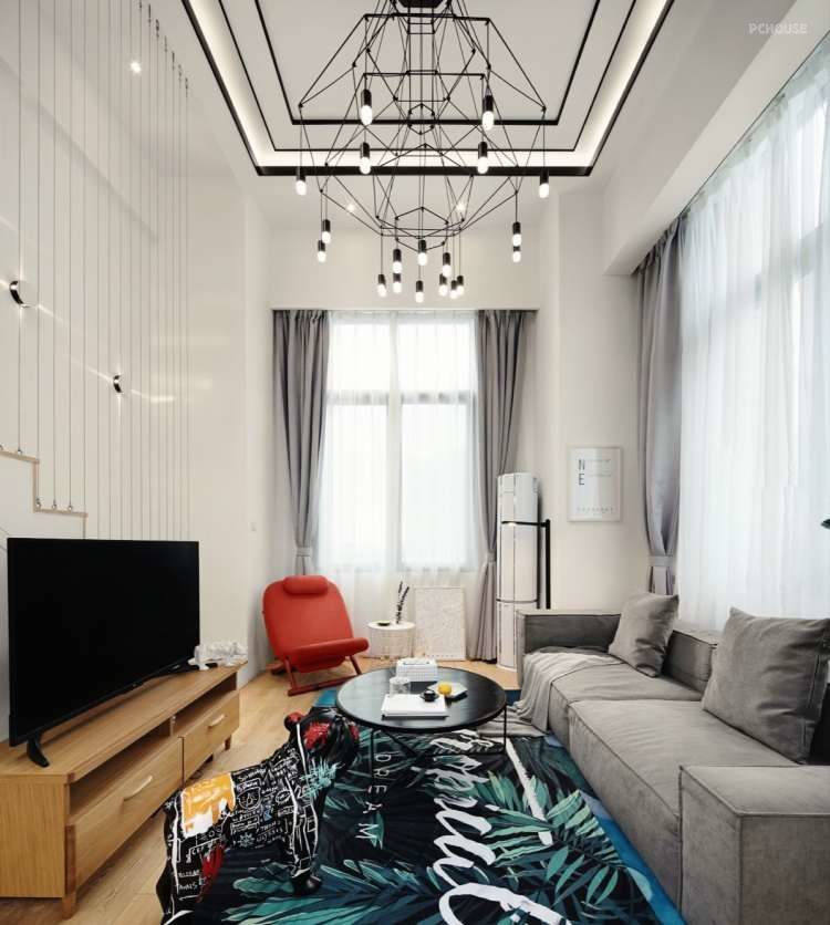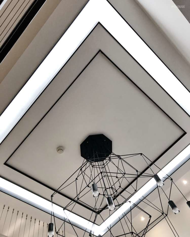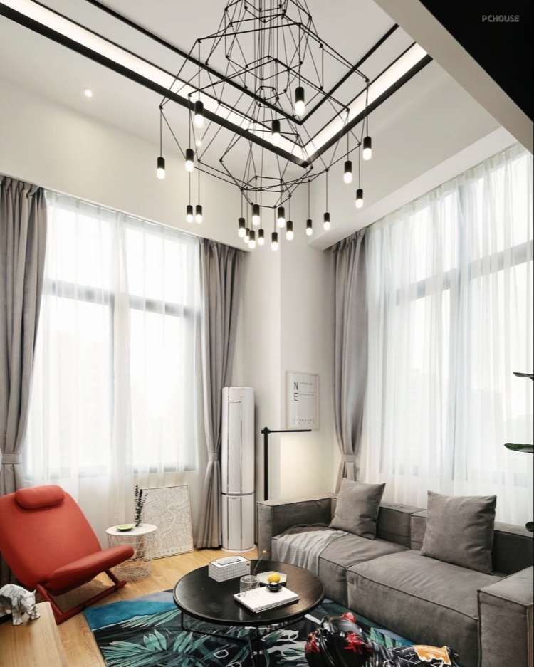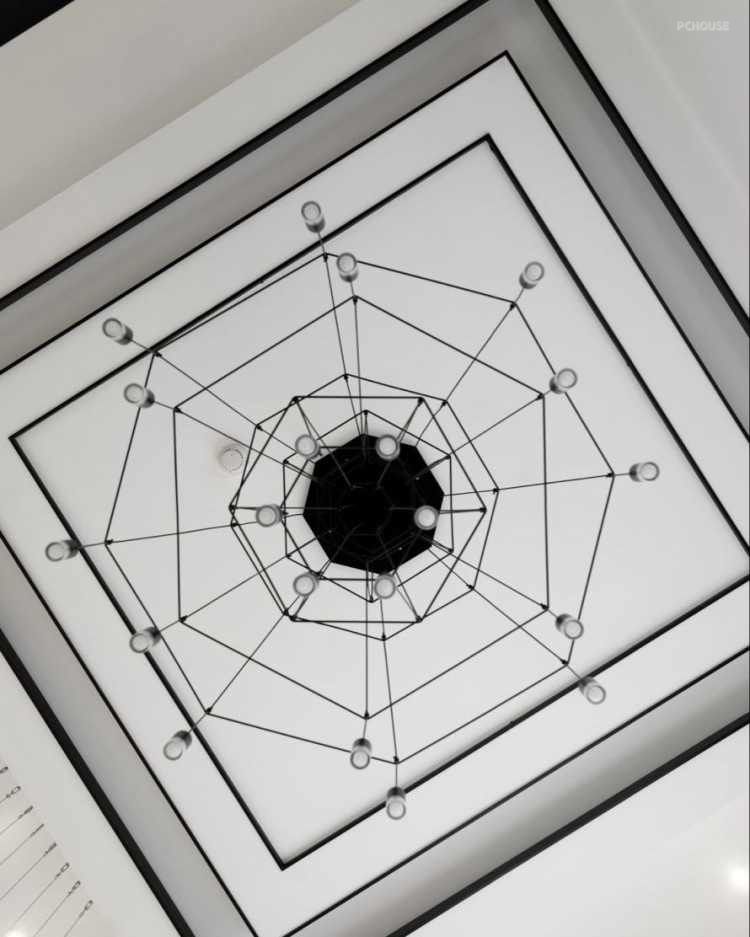 客厅区域做了大的挑空,然后一个超大的蜘蛛网吊灯,当初师傅装这个灯也装了4个小时.二楼用了定制的黑色铁艺栏杆.