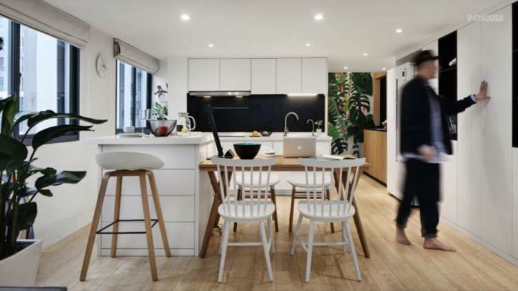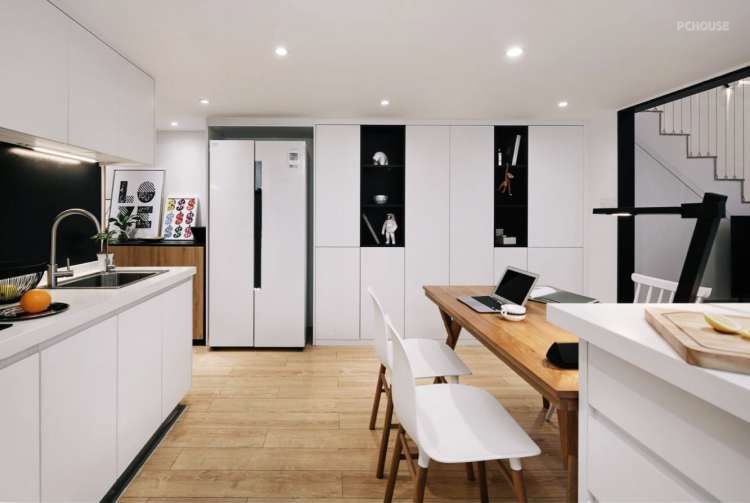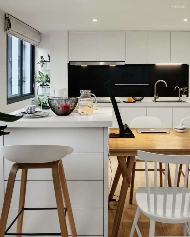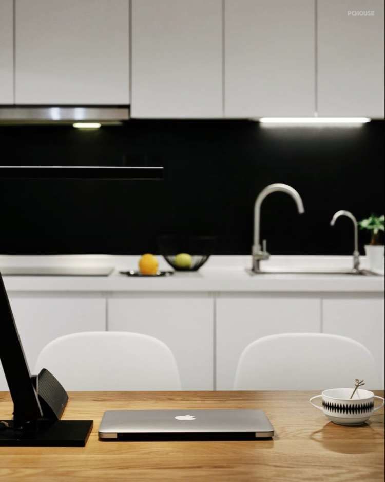 餐桌.椅子.吧椅都是某宝买的,橱柜黑色部分是黑色烤漆金属板.白配黑就是经典