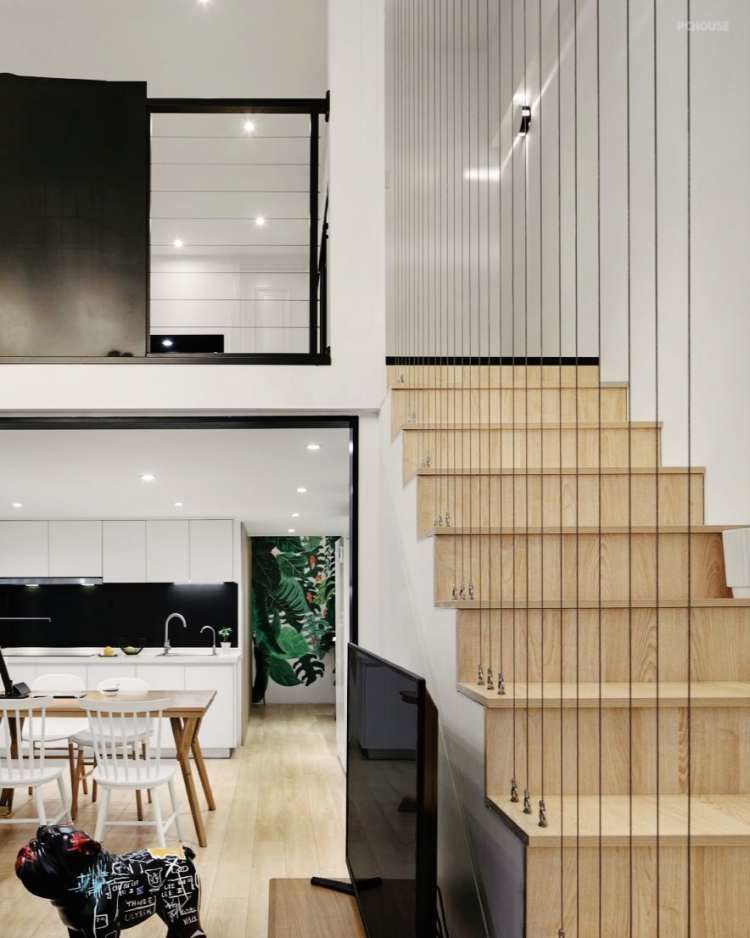 楼梯用了铁丝吊筋,看上去很细很酷.楼梯下方做了储物柜收纳,平时的旅行箱和杂物都可以放楼梯下面这个储藏区