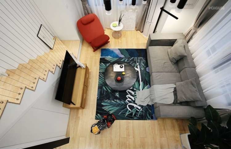客厅的另一个面.造作红色的沙发很上镜哦.地面是ins风的毛毯,我拿来当地毯用了,因为图案太好看,还便宜.