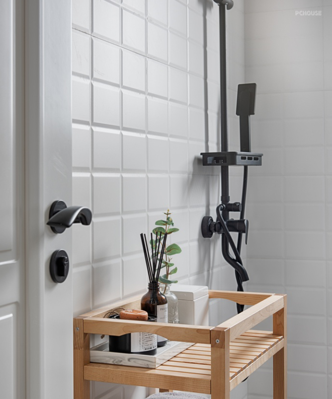 客餐厅区域则在地面上用木地板和六角砖硬碰,来划分两个区域,整体打成一片,使整个客餐厅区域更加通透,家里的扫地机器人打扫这两个区域也非常方便!