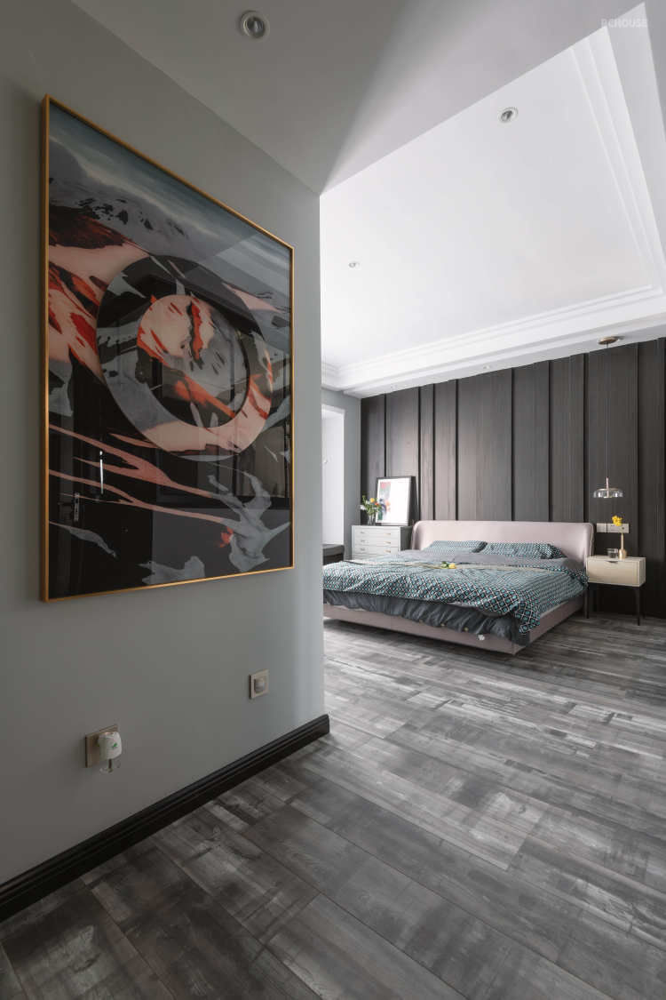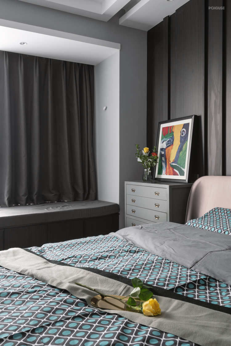 如果你也在寻找冷色调里蕴藏的淡淡温度,这个卧室会是个不错的选择。深沉的冰川灰色调浸透了整个空间,营造出绅士浪漫的感觉。