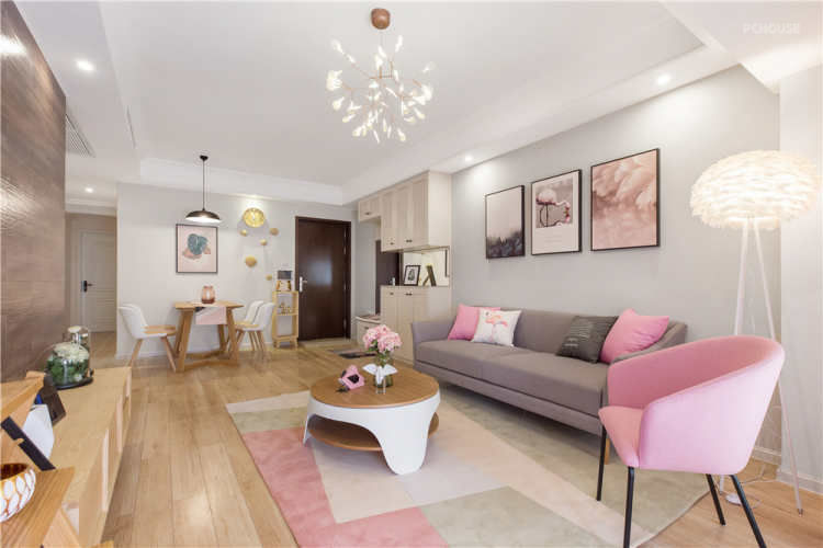 ?客厅选用了窄扶手的灰色三人沙发作为主沙发,搭配浪漫别致的羽毛落地灯,打造出温暖舒适的空间氛围,而粉色的单人沙发作为客厅跳色的同时,也为空间增添了一丝时尚感。