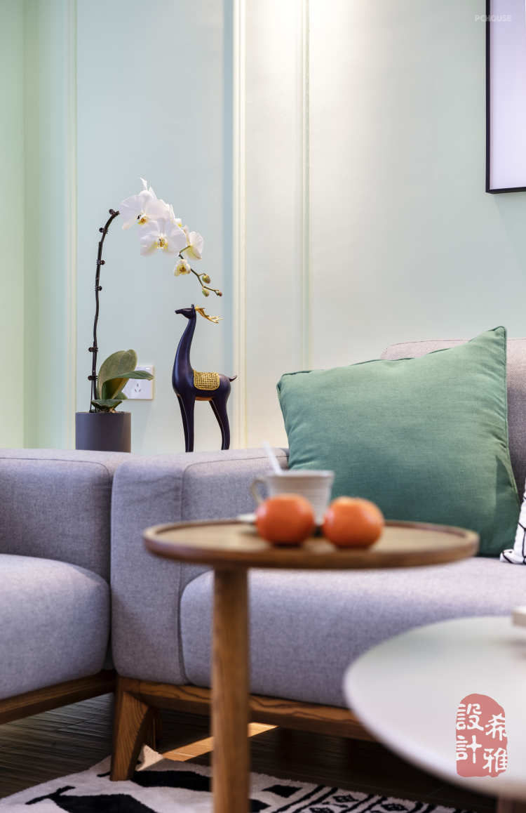 客厅的全景图,整体的颜色用的比较清爽,沙发背后采用的薄荷绿,在造型上加了些线条。朝南的客厅采光很好,天晴的时候,可以躺在沙发上晒太阳。