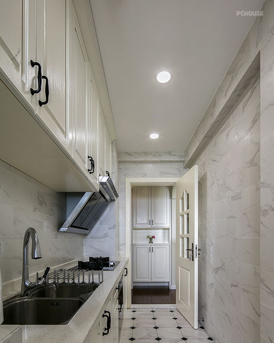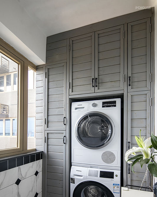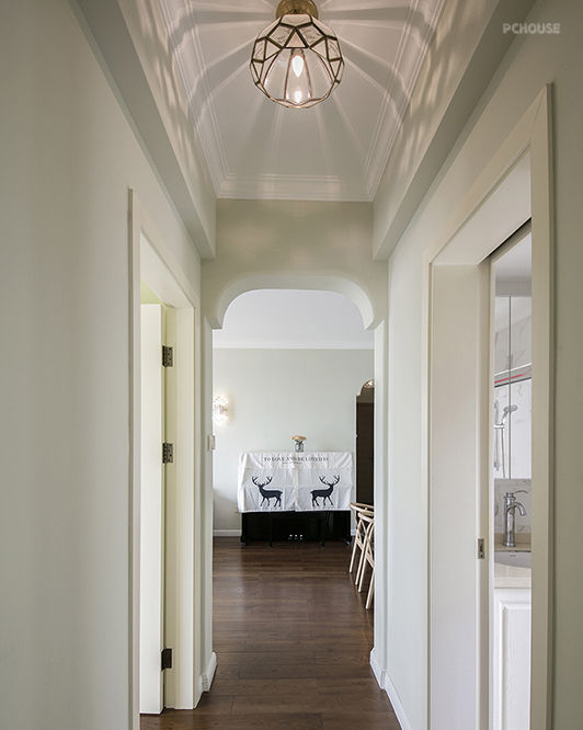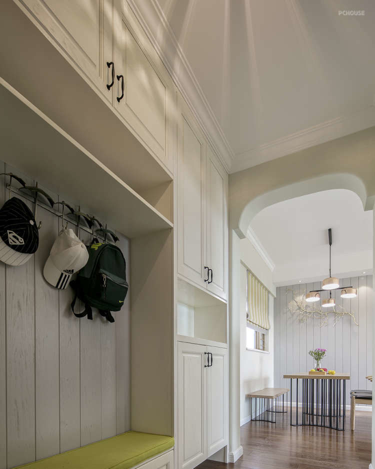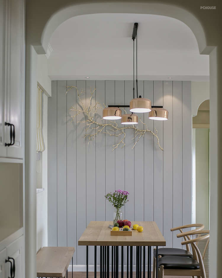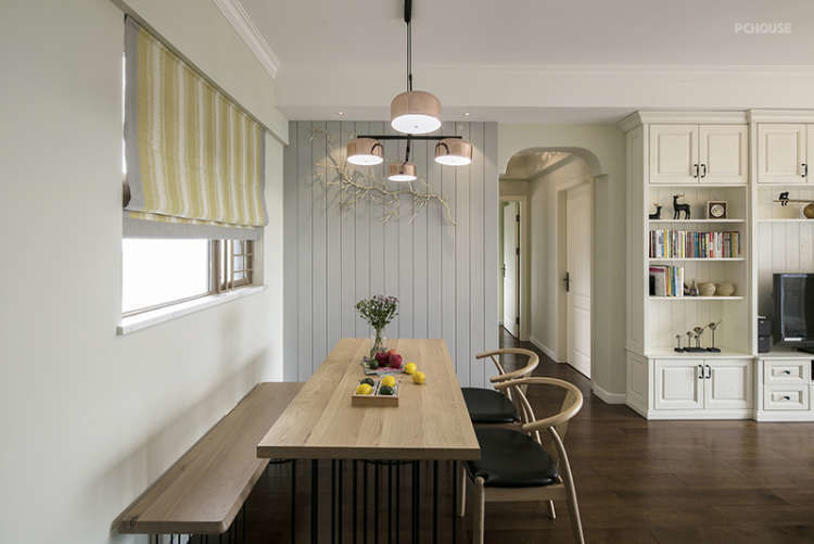 沙色的墙面,浅色的护墙板,配上奶黄灰边的窗帘,休闲而优雅。