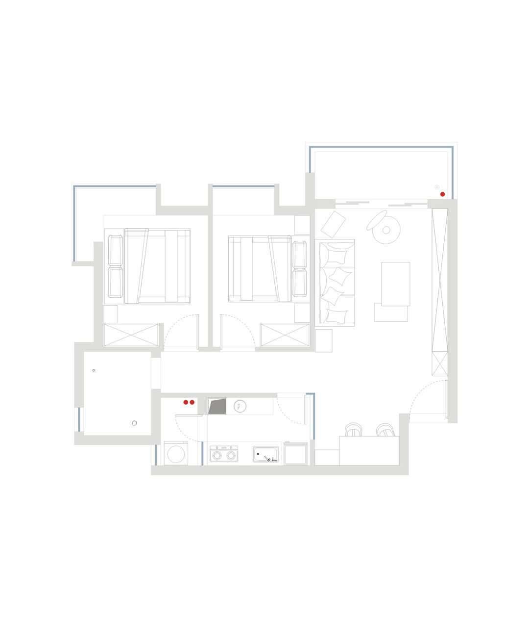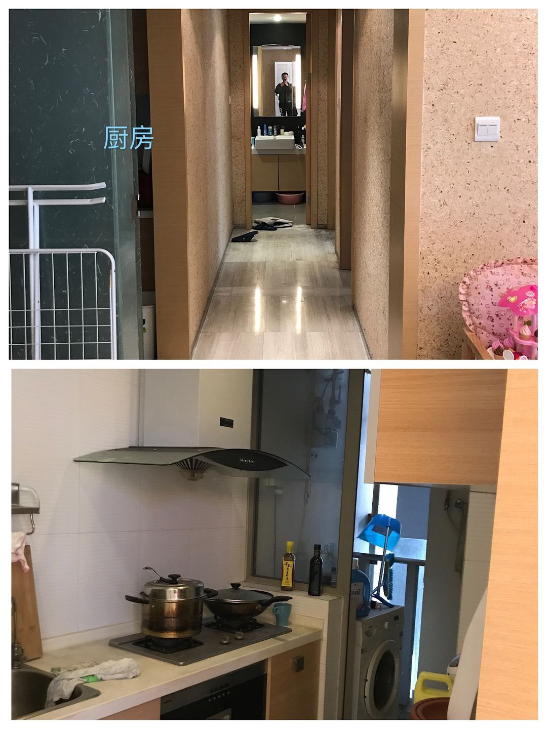 厨房位于生活阳台与餐厅之间,无采光,净深窄,烟道尺寸大,占据厨房过道位置。操作动线不合理,橱柜台面小,无法放置其他电器设备 ◎ 生活阳台处于侧边夹位,只有少部分通风和采光,无法与厨房外部区域流通。且尺寸方正,空间未得到合理使用