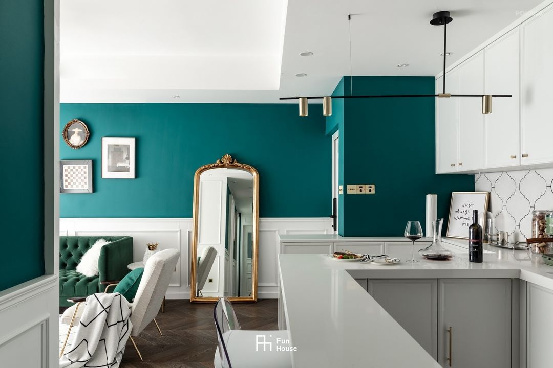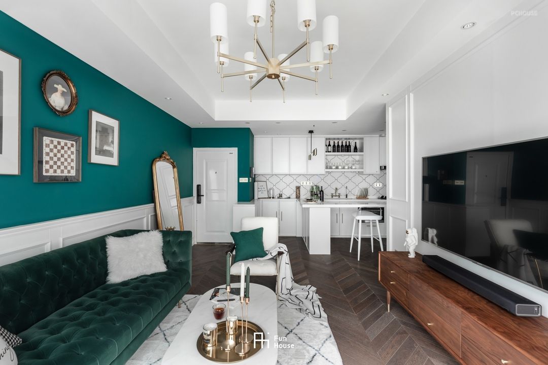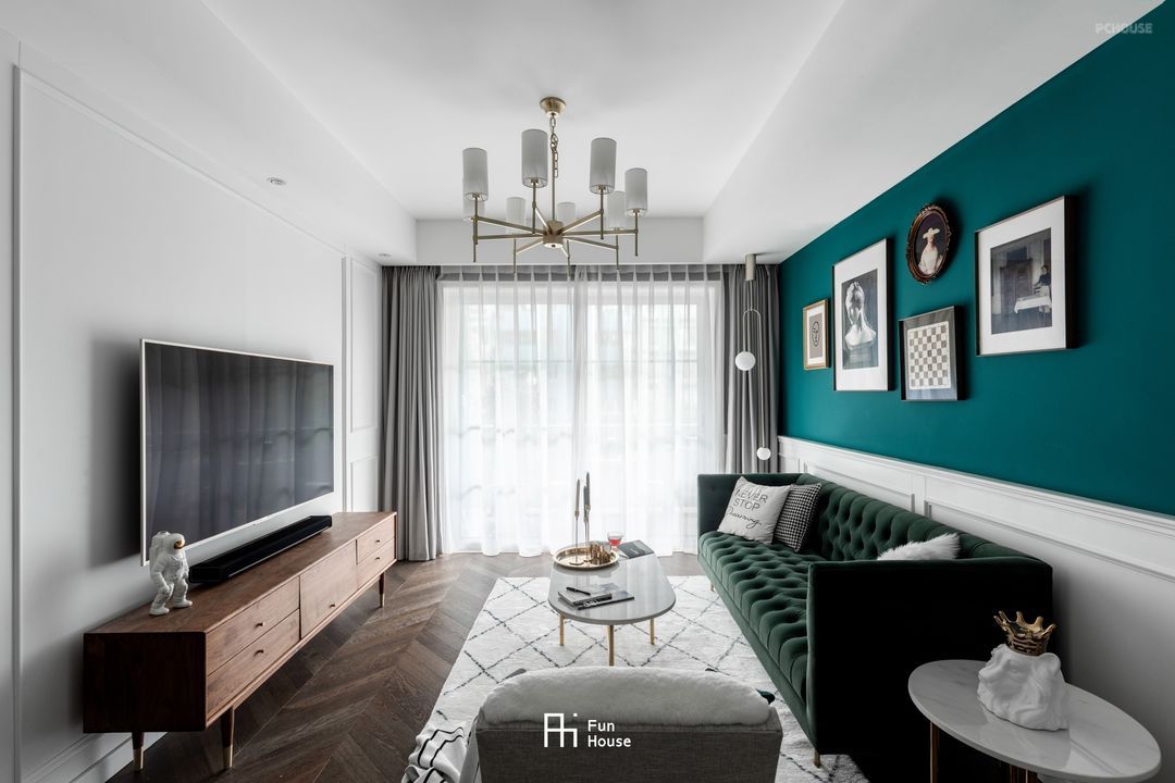 沙发主位上半部墙面选用复古绿,白色护墙板铺装墙裙,搭配不对称的挂画组合,营造无拘的轻奢感。