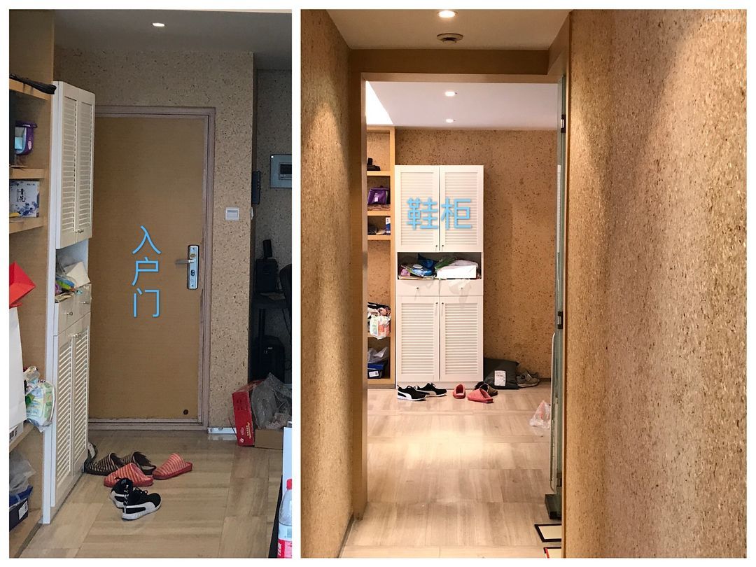 入户玄关位置不明确,储物距离远,空间分散、混乱。开门即见鞋柜侧面,既挡住视线也不美观。
