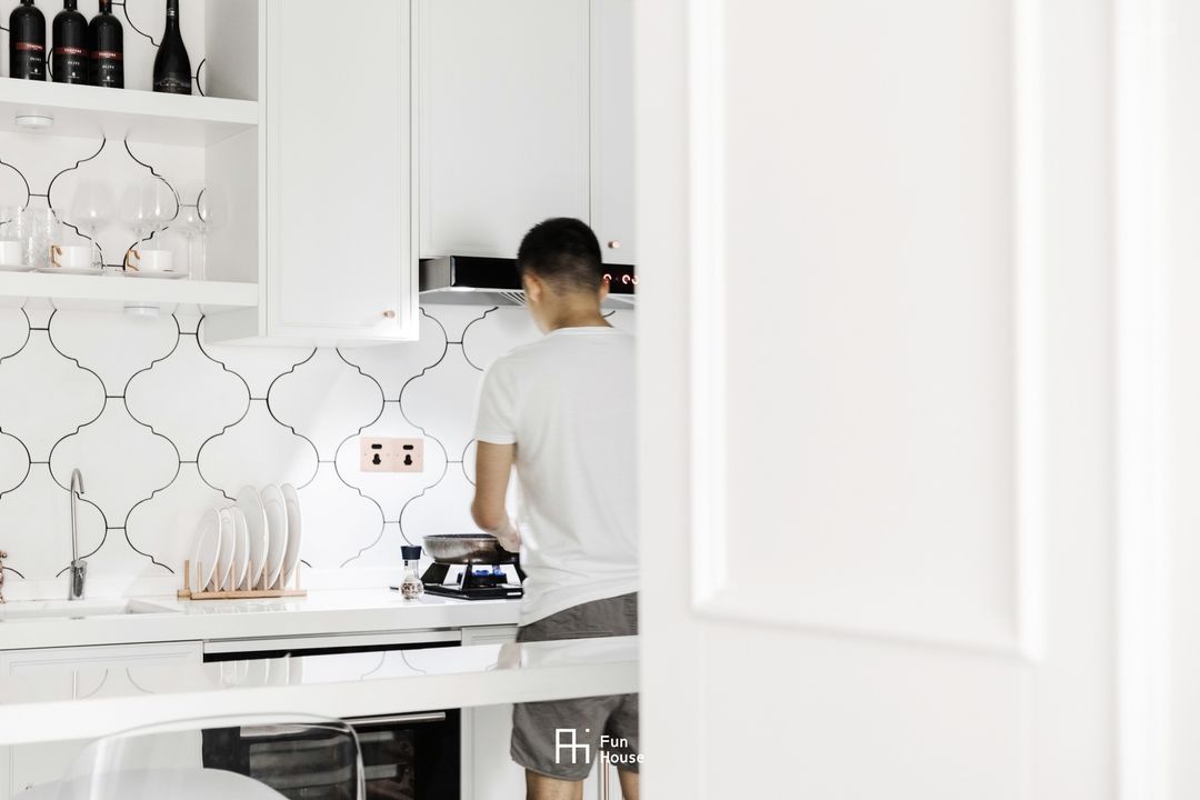 厨房的色调很干净,我们巧妙的将此区域整体留白,像一副故意没有涂完的话,让大LDK空间不会显得隆重累赘。
