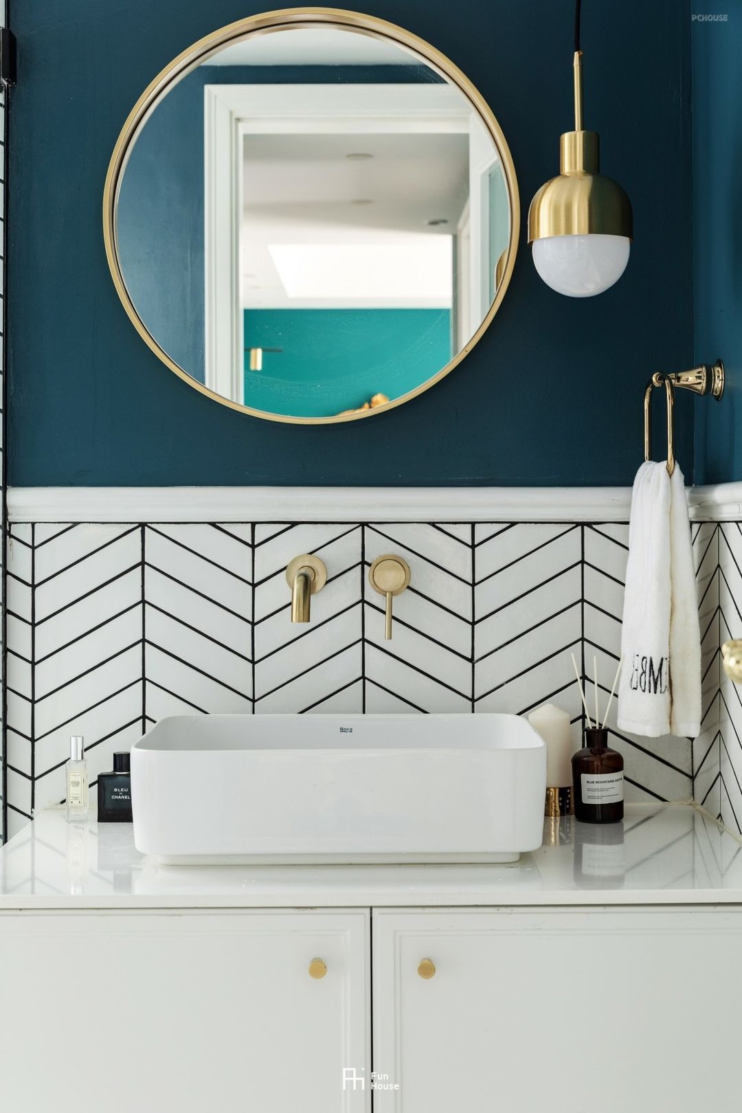 盥洗区采用半砖半漆设计,让墙面有了腰身。鱼骨拼白砖从地面向墙裙延展,墙面选用复古跳跃的蓝绿色防水漆,白与绿辉映。