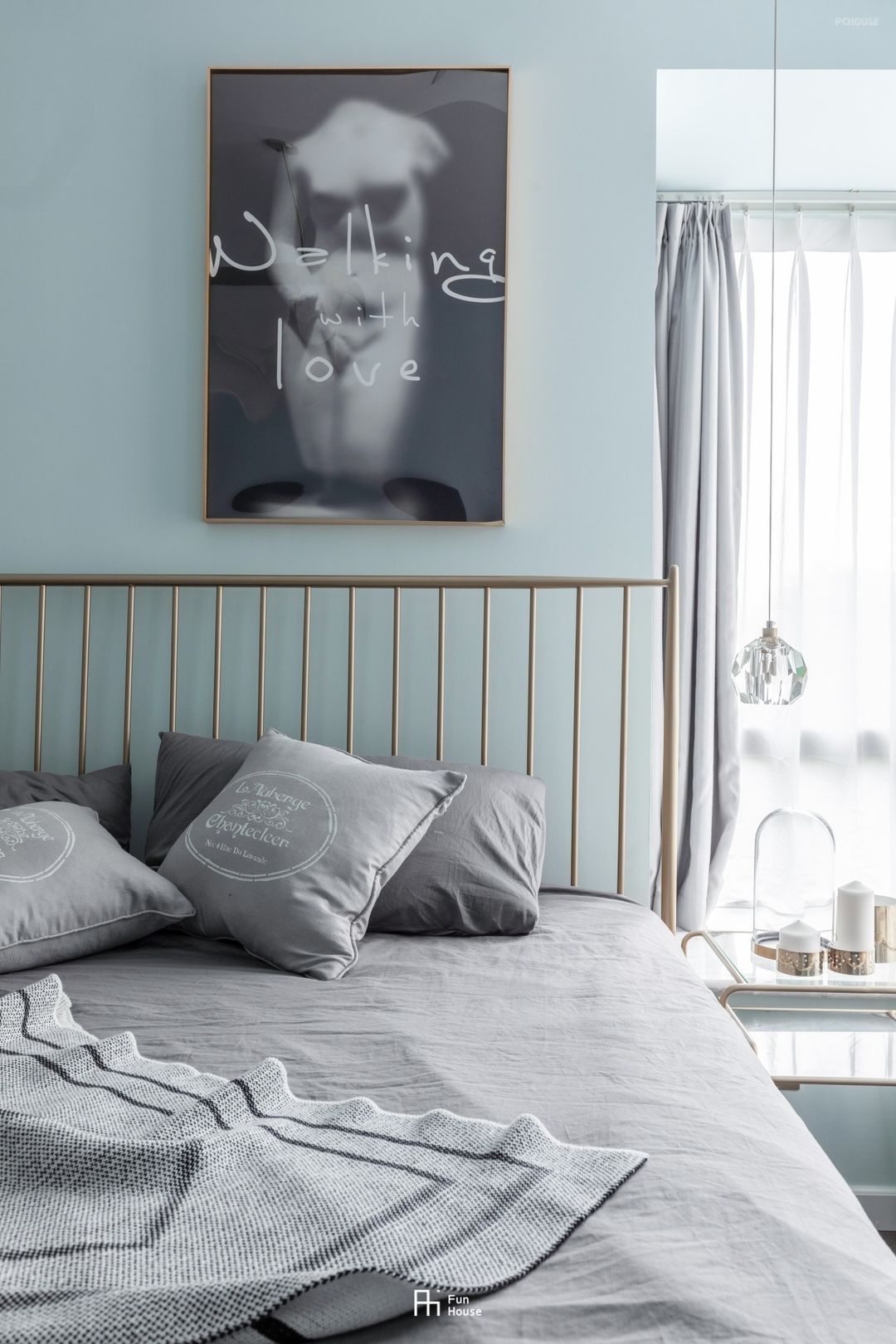 推开卧室的谷仓门,是我们讲述的一个关于仲夏的幻想。湖蓝的墙,袅袅悬挂的雾帘吊灯,金色的床沿,如梦光华,让人迷失却不让人慌张。
