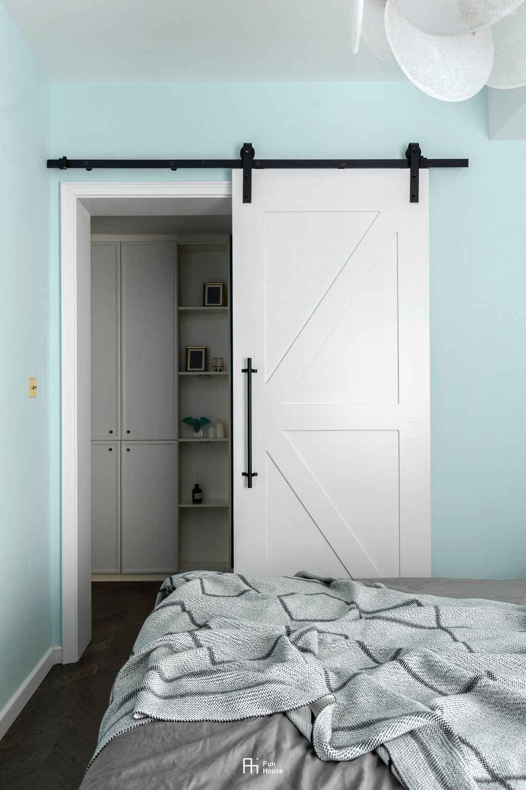 我们摒弃平开门而用谷仓门,最大限度的节省了“开门”动作的空间,同时也使卧室更添风情。