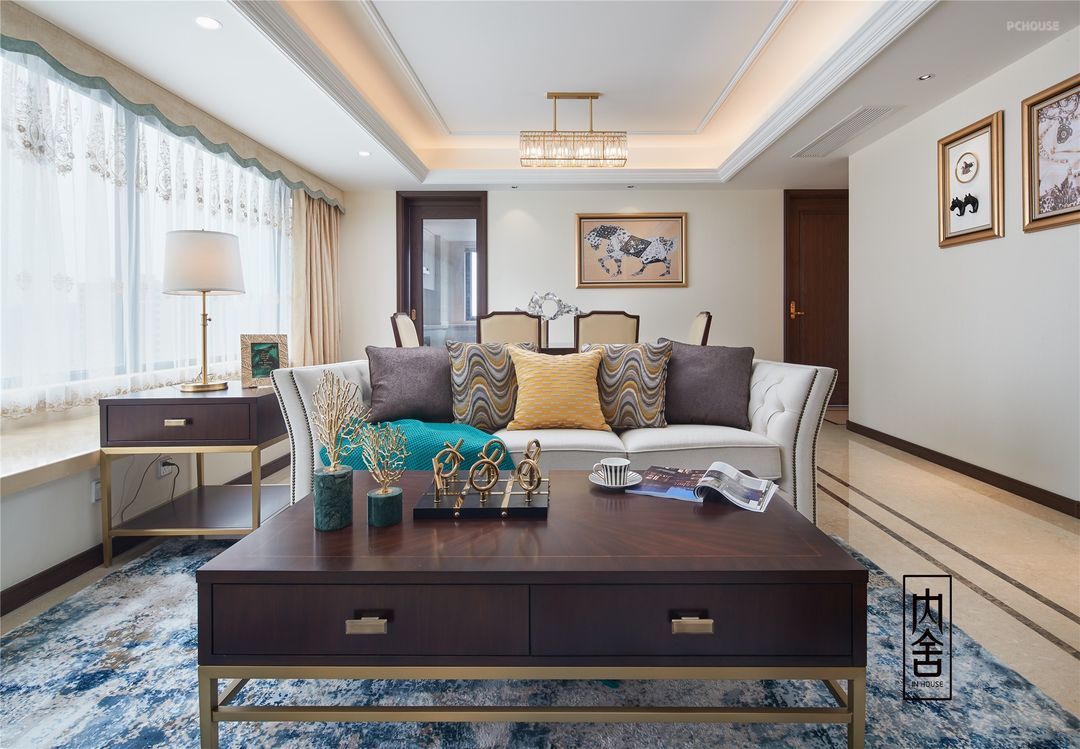 茶几、电视柜、角几以其刚直方正的线条造型,搭配柔软的布艺沙发和温润的皮质单人椅,刚柔并济,显得大气沉稳。