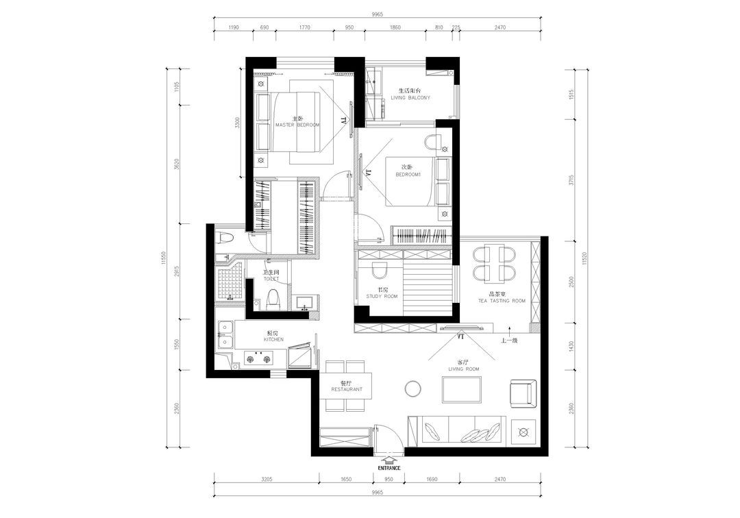 前言: 本案是一套三室两厅的小户型,业主希望能有一个较大的活动空间和泡茶区,由于长方形的空间,需要兼顾客厅和餐厅,如果用传统的方式,把电视背景放在东面的位置,势必让客厅显得狭小,同时让整个空间显得零碎。所以在设计上,将电视背景墙设置在北面,利用柜子、电视背景和地台相结合的手法,让整个活动空间翻倍,给人一种大户型的感觉。