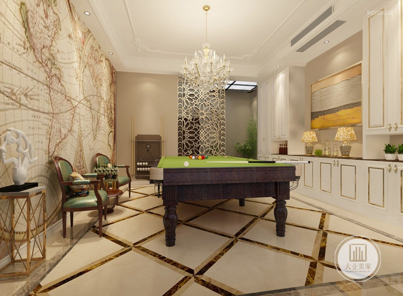 负一层空间主要用于一家人招待朋友,一家人打台球,喝茶与品酒,和女主人洗衣晾晒的地方。为了使地下室显得不单调,加了简单的地面拼花,车库入户做了简单的景观,让回家变得与众不同。娱乐室一面墙使用女主人想要的世界地图壁纸,一家人可以慢慢地把旅游的照片集满整面墙,实现女主人带着孩子环游世界的梦想,家中满满的幸福气息。