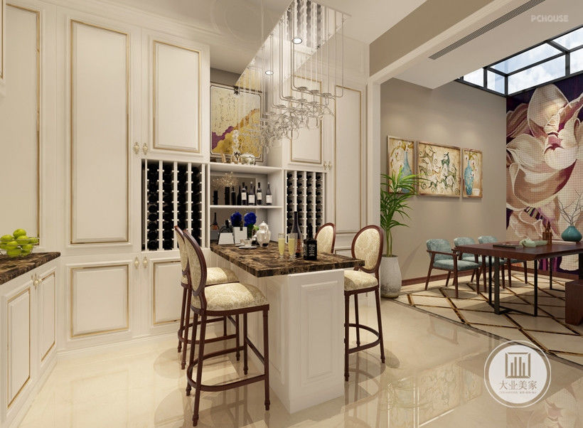 一层用于休闲,家人交流,吃饭,女主人做饭。餐厅增加西厨区,女主人可以和女儿一起做甜点。设计师按照业主喜欢,大面积采用白色的护墙和奢华的家具。软装选择上偏厚重,使空间亮而沉稳。