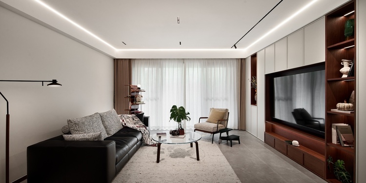 客厅以灰黑为主色调,将阳台空间纳入客厅,开阔的视野加上绝佳的采光,使整个空间敞亮明净。电视背景墙采用木饰面作为装饰,营造出大气简洁的氛围。摒弃传统的吊灯,采用点光源加线光源的设计,让空间每个角落、背景的光源层次分明。表达着简洁、时尚、低调的生活品质。