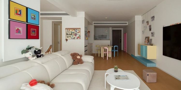 设计师:入户口看到客厅,就能看到这套房的亮点,色块拼接墙和装饰画组,一开始想要营造艺术氛围比较浓的氛围,后来协商的后造就现在的墙。沙发选用的圆弧的款式,让空间显得更加的圆润温馨。