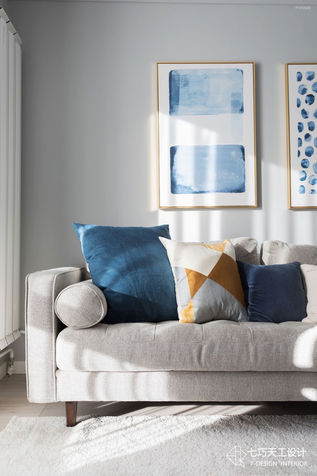 沙发是业主在上海逛家具店时带回来的,和客厅整体的灰色调非常协调。(涉及材质:棉麻)#地毯#沙发#装饰画