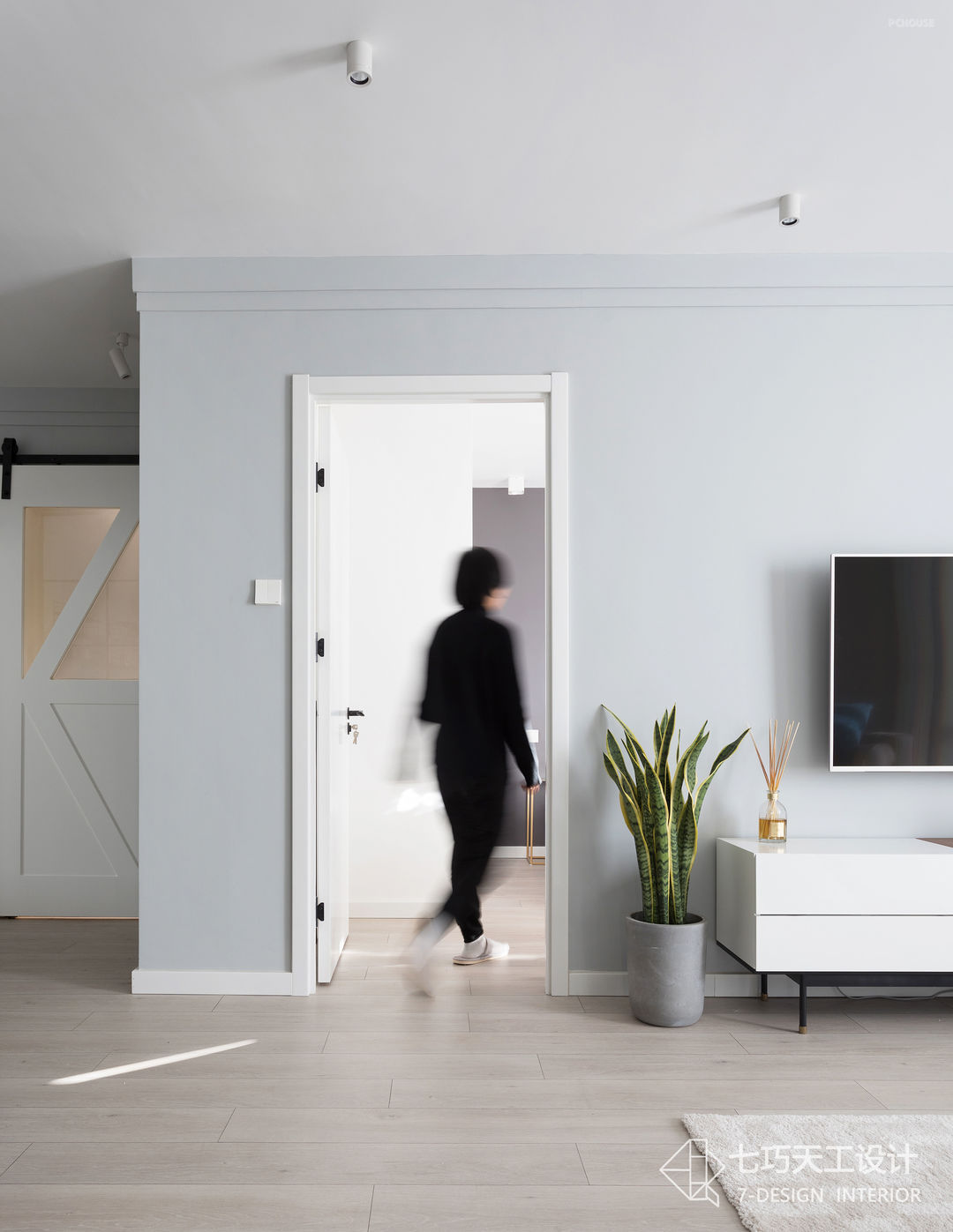 卫生间位于入户门左侧,利用凹墙结构增加了储存空间,用来放置杂物。(涉及材质:混油、谷仓门、石膏线)#卫生间#谷仓门#收纳