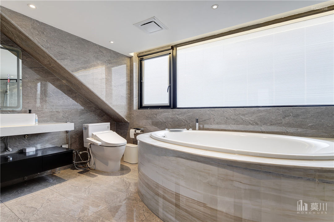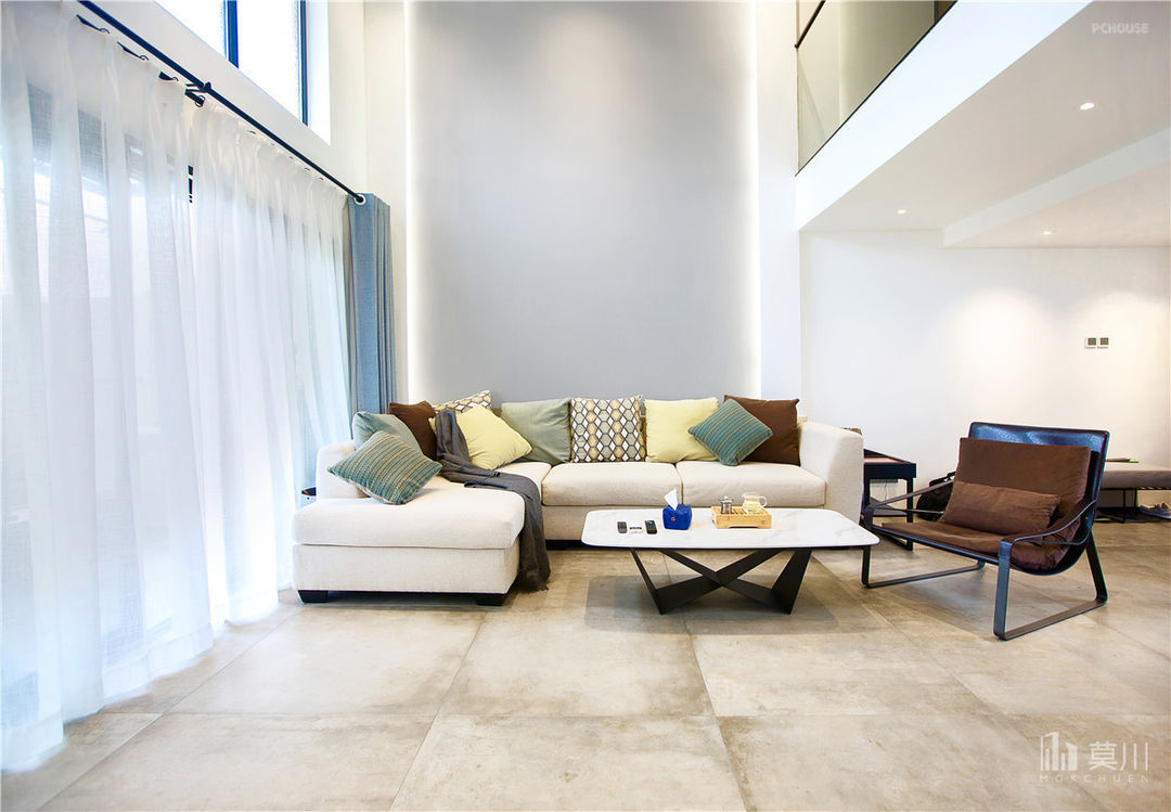 沙发背景及过梁采用水泥板,空间更有质感。沙发背景墙上方采用水洗墙的设计,灯光铺设下来,有一种瀑布流水的既视感。我们将中央空调暗藏于斜顶中,完美解决了客厅斜顶带来的影响。