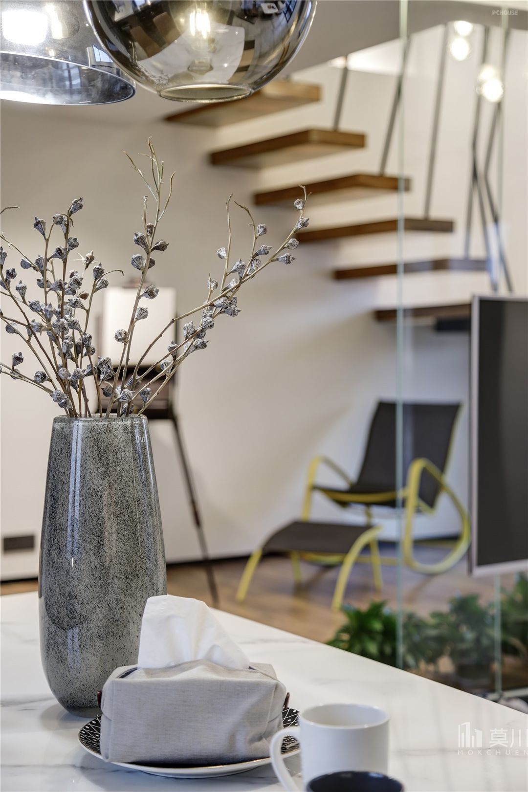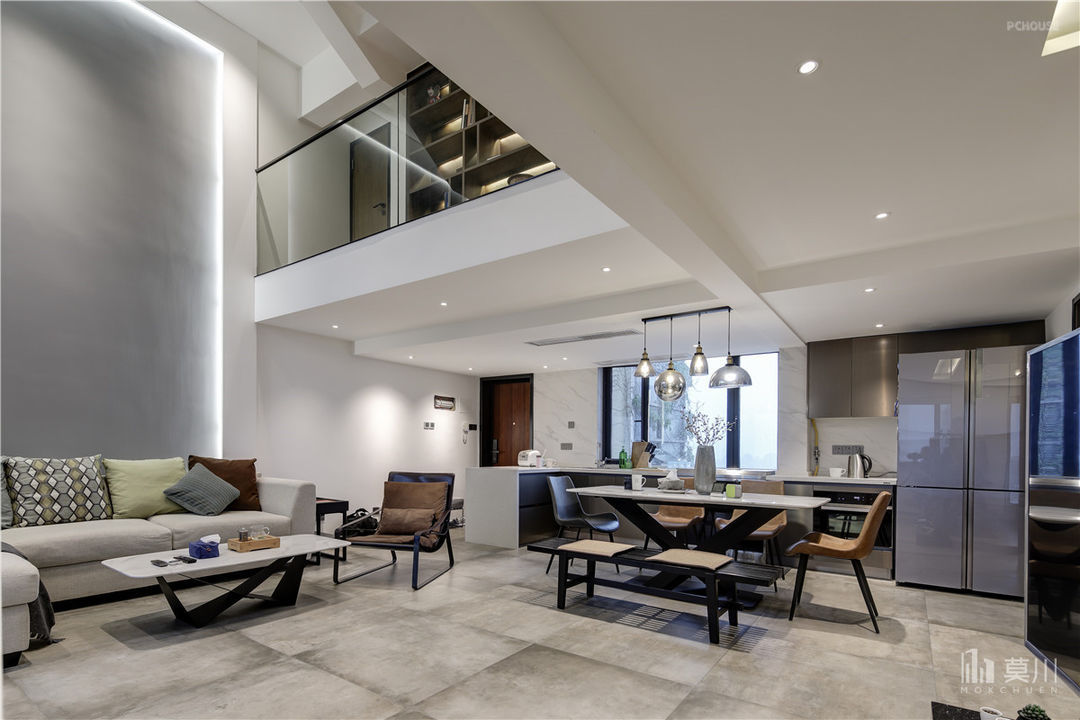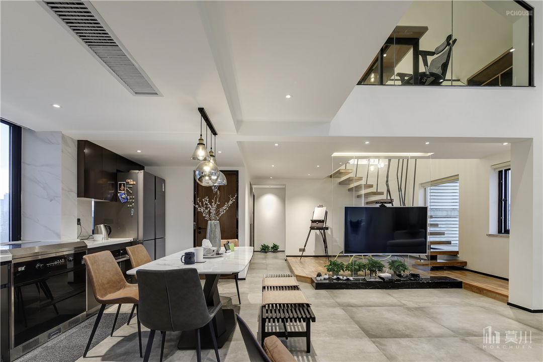 1.一层客厅区域楼层不高,设计师把原有客厅区域楼板拆除,变成中空区域。