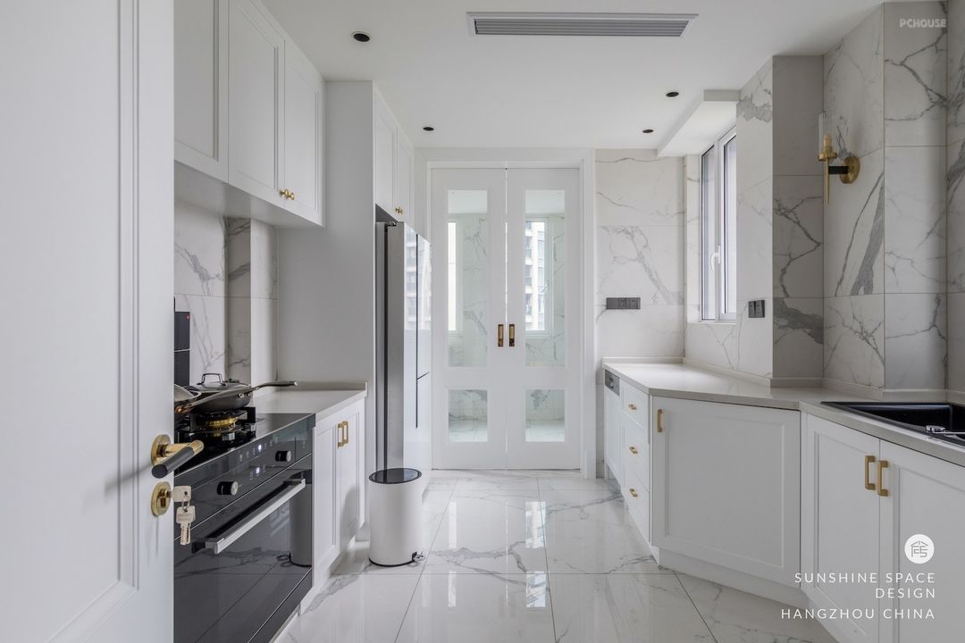 主卫空间也足够大,做了宽台面的设计搭配大理石和金色元素,更显大气。