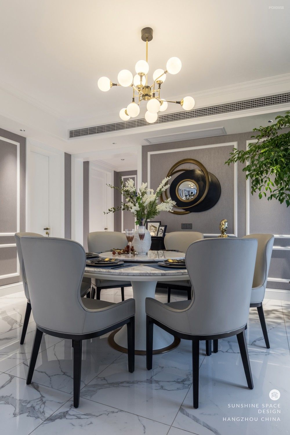 客餐厅是一个家庭的核心区域,我们希望在实现功能最大化的同时,也让这个区域成为家庭成员之间亲密互动的纽带,因此餐厅是与客厅相连接的。客厅采用的是无主灯设计,餐厅则需要一个别致的吊灯,顶部的集中光源令用餐区显得更加温馨。