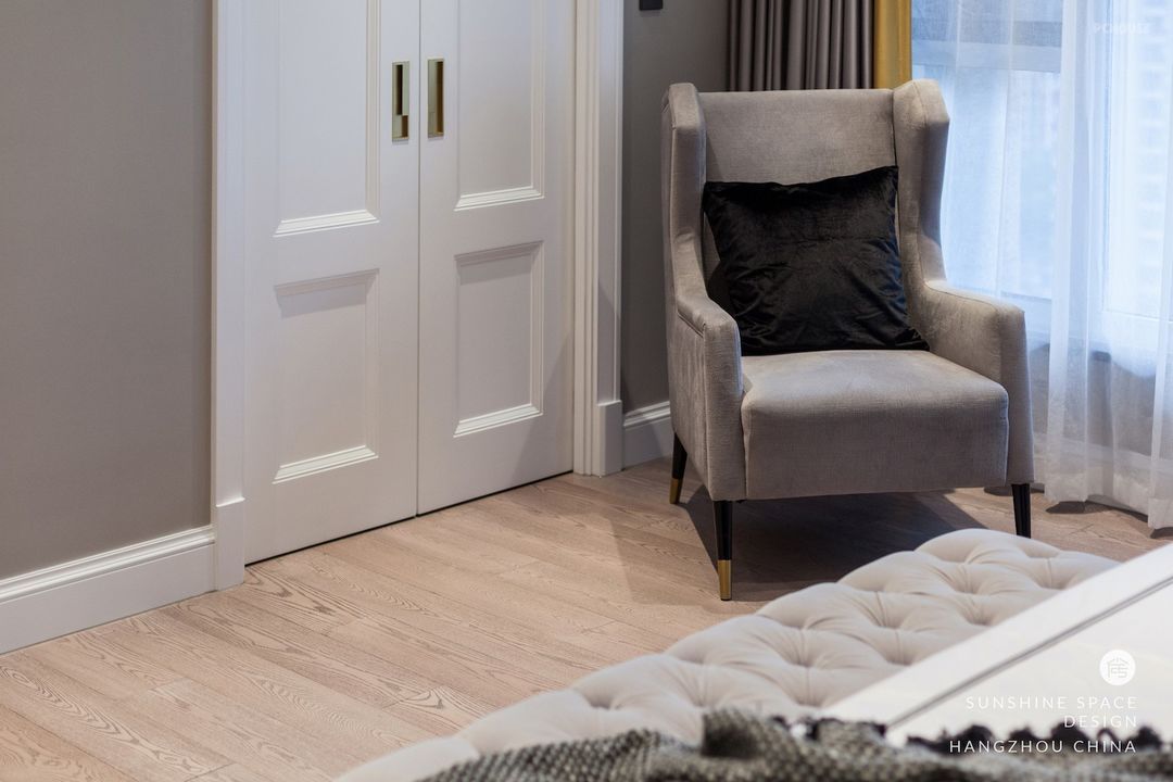主卧区域原本是客厅的挑空层,通过现浇之后,形成了现在的主卧空间,非常宽敞大气。整体以黑白为主色调,配上局部金色点缀,使空间变地更加优雅、精致。