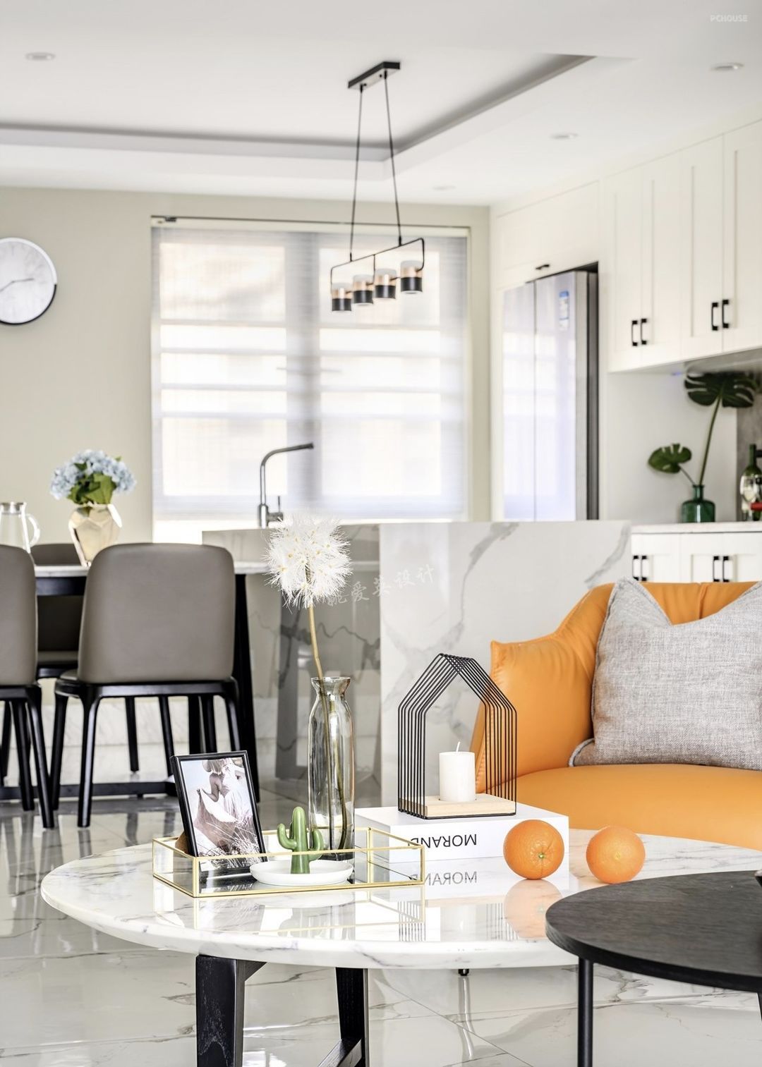 餐厅餐桌旁的储物柜采用隐藏式,摇身一变,成了装饰柜,就连储物也能如此名正言顺。厨房门采用金属窄边玻璃门。