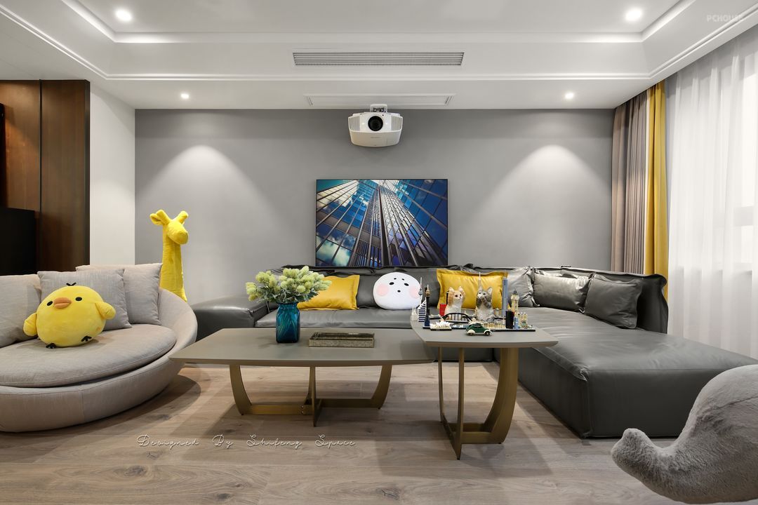 关于电影的第一幕,客厅是黑白灰的旋律,永不过时的高级灰背景墙加上帝王黄的动物饰品进行点缀,沙发的抱枕与窗帘的色彩与其呼应,整个空间既简洁又明亮。与玄关的硬朗不同,这里是一个童话色彩的世界。