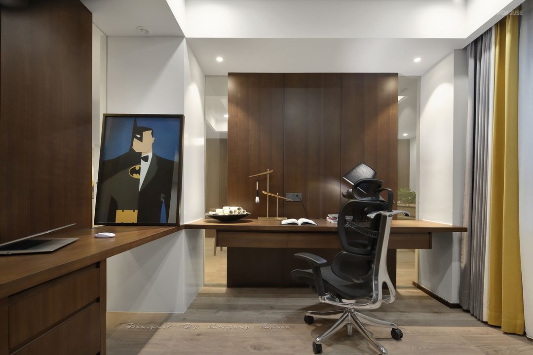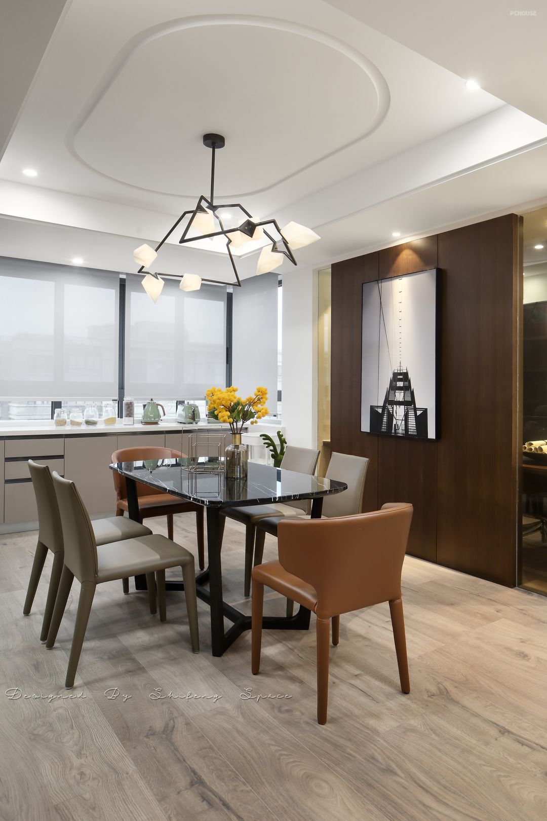 画面切换到餐厅,顶面延续简约的线条感,中间椭圆的凹槽与黑色理石餐桌相对应。餐桌是这个空间的中心点,浅棕色餐椅与地面对应,深棕色的餐椅与墙面木饰面对应。设计师将呼应手法运用自如,呈现出一种现代摩登感。