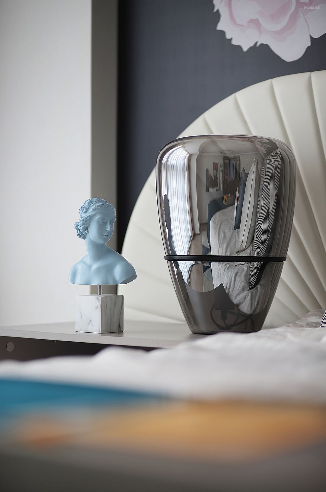 整体的床相接大幅喷绘,让真个空间大气中带着安静,更适合身体和心灵休息,电视柜上放着她喜欢的挂画和他精心挑选的物件。沉思安静,旁边的衣柜兼储物柜满足了整个空间的收纳,为第二天的工作提供了一个很好的衣服准备。
