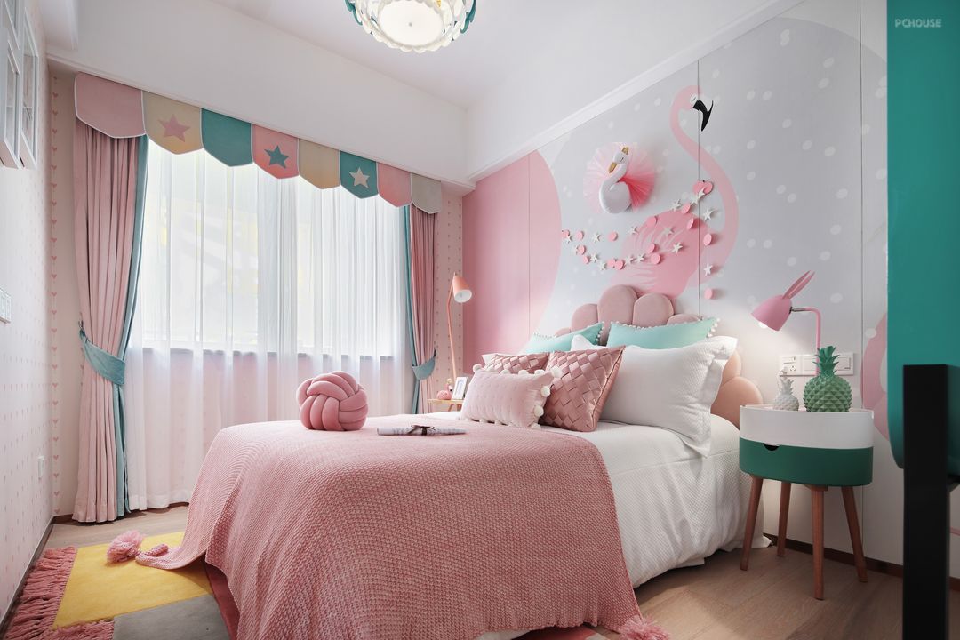 女儿喜欢看童话故事,喜欢看动画片《火烈鸟的骄傲》,墙面火烈鸟的喷绘,拉高了整个房间的空间感。给她想要的童年是父母给与最好的爱护,粉底色色调结合点缀的五颜六色其它物品,是女儿最爱呆的地方。