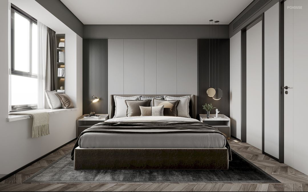 整体以灰色调为主,做一些低饱和度的软装搭配,墙面留白,去主灯形式,点光源做氛围衬托。