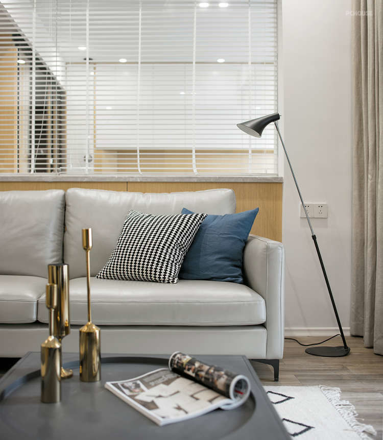 主卧与客厅之间在半高收纳柜上方做玻璃为隔断,百叶帘保证卧室的私密,让空间独立且不失整体感。